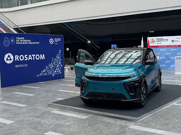 Центром внимания для посетителей выставки в Минске стал расположенный в середине холла электромобиль «Атом», который должен выйти на рынок в следующем году. Он позиционируется как «первый на 100% российский», основные компоненты которого — батарея и интегрированный электропривод — производятся дочерними предприятиями Росатома.